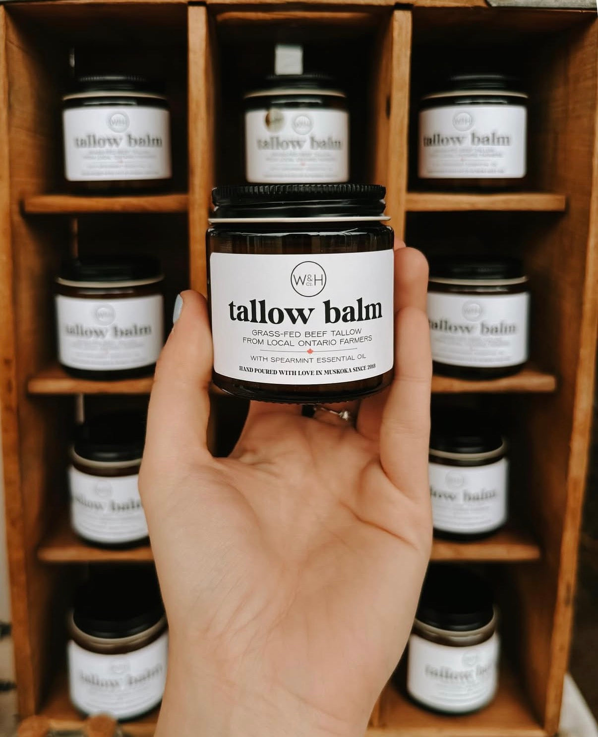 Sourced from local, grass-fed Northern Ontario farms, this deeply nourishing tallow balm is a return to skincare the way nature intended. Rendered slowly in small batches, grass-fed beef tallow is rich in skin-loving fatty acids and naturally occurring vitamins A, D, E, and K. Its composition closely mirrors our skin’s own oils, allowing it to absorb beautifully while helping maintain moisture and support a healthy skin barrier. Blended with jojoba oil, this balm helps soften and balance the skin without clogging pores. Olive oil adds antioxidant support and long-lasting hydration, while a light touch of spearmint essential oil provides a fresh, clean aroma and a naturally cooling feel. The result is a simple, honest balm that melts into the skin and delivers lasting moisture without feeling heavy. Ideal for dry hands, tired feet, elbows, and anywhere your skin needs extra care.